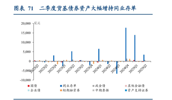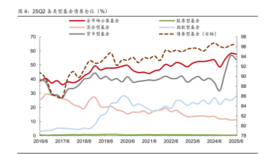 2025Q2 全市场公募基金债券仓位小幅下降 0.4pct 至 57.8%。细分类别来看,货币型基金持债占比环比减少 2.5pct 至 54%、降幅最大,而指数型基金持债占比环比增加 2.6pct 至 27.7%,债券型基金持债占比环比增加 0.3pct 至 96.6%,其余类型基金持债占比变化不大。分位数来看,债券型基金、货币型基金和指数型基金持债仓分位数均为 97.3%、接近 2016 年以来的历史高位。