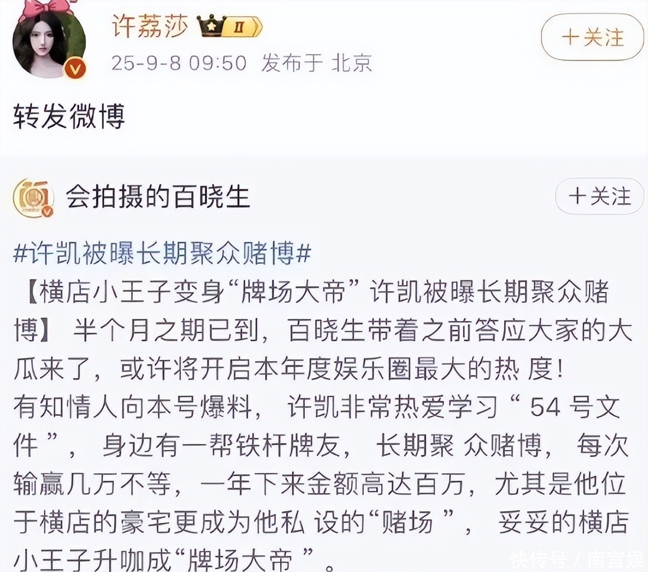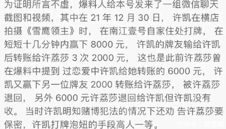 并于9月8日再次曝出“大瓜”,直指许凯长期聚众赌博,这一次,不仅直接把上牌桌的视频丢出来,还有聊天记录为证!