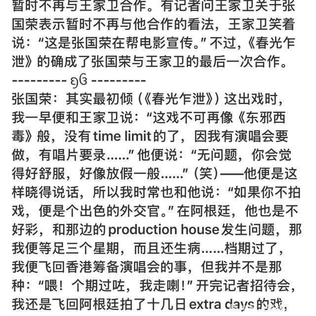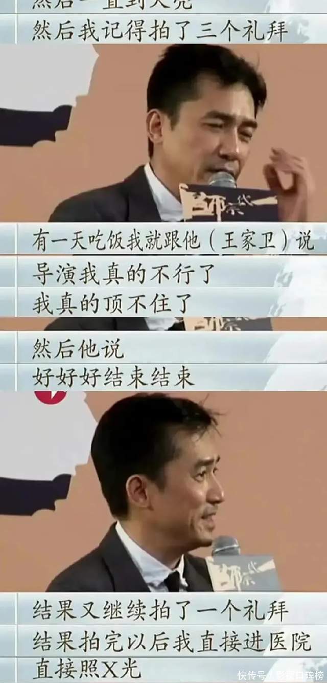 这不禁让人回想起这些年来,王家卫与多位顶级演员的合作均已中断。最出名的是张国荣,在拍摄后《春光乍泄》后宣布不再合作,在自己的97年演唱会上坦言身心俱疲;同样,张曼玉因《2046》戏份被删,一样觉得过于消耗演员;张学友因一个抬头动作重拍60次,心里留下阴影;梁家辉不仅替张国荣发过声,说《春光乍泄》是利用他的热度,更直言享受不了《东邪西毒》。