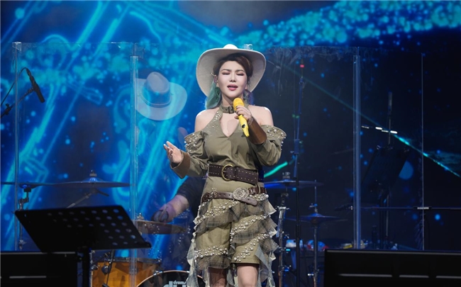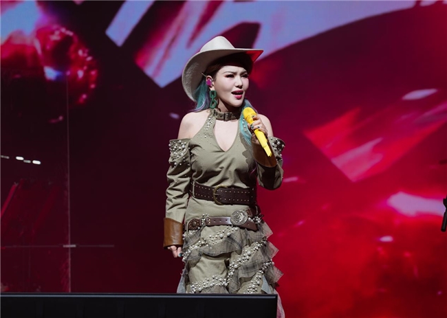 军绿色牛仔风“战袍”更是将她的洒脱与帅性完美表现,不对称长裙搭配随性流苏和牛仔帽,充满独特的艺术设计感,将潮流与艺术大胆融合,个性且充满张力,且与所演唱的《天边的天籁》等歌曲精准对接,使服装歌曲场景融为一体。